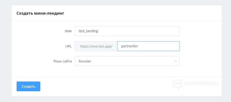 Для создания мини-лендинга требуется указать имя, ввести URL и выбрать язык сайта.