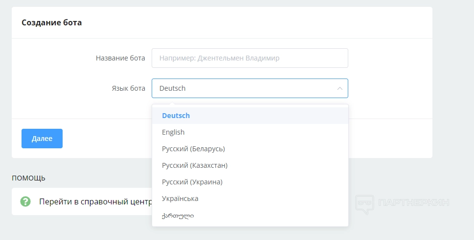 Создать собственного чат-бота можно на любом языке, но если выбрать: немецкий, русский, английский, украинский или грузинский, это повлияет только на стандартные сообщения бота, которые можно легко кастомизировать.