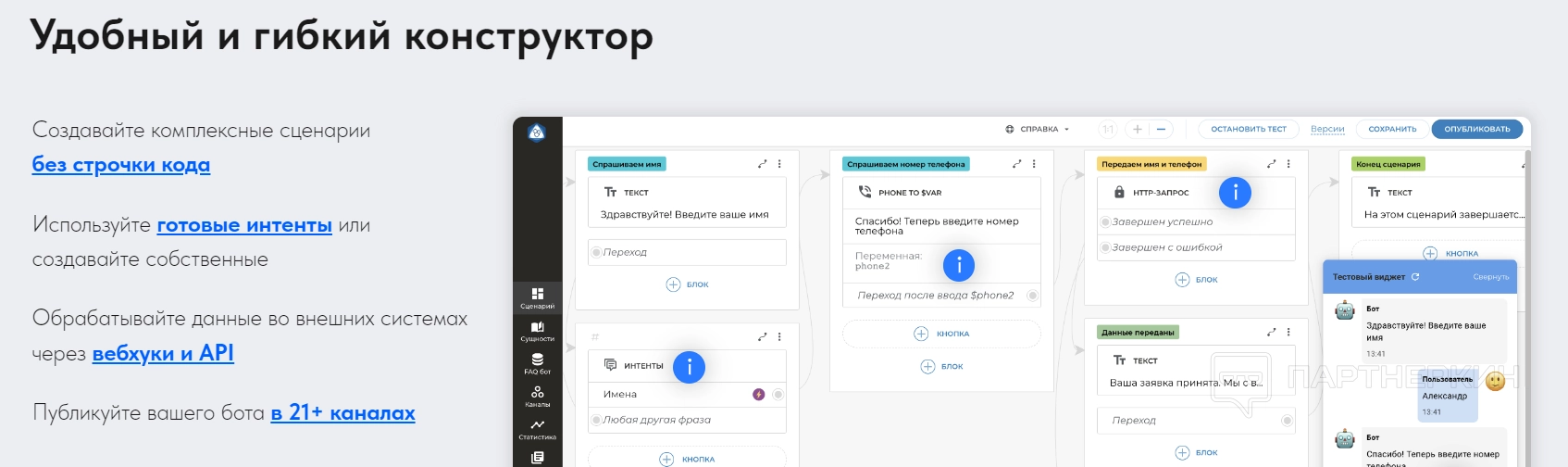 Нельзя сказать, что система конструктора серьезно отличается от аналогов на рынке. То, что определенно стоит внимания — система навыков, пусть она и заточена в основном под сферу маркетинга. То, что разработчики решили вводить искусственный интеллект, показывает, что данное направление развивается, и его обязательно стоит попробовать использовать в своей работе.