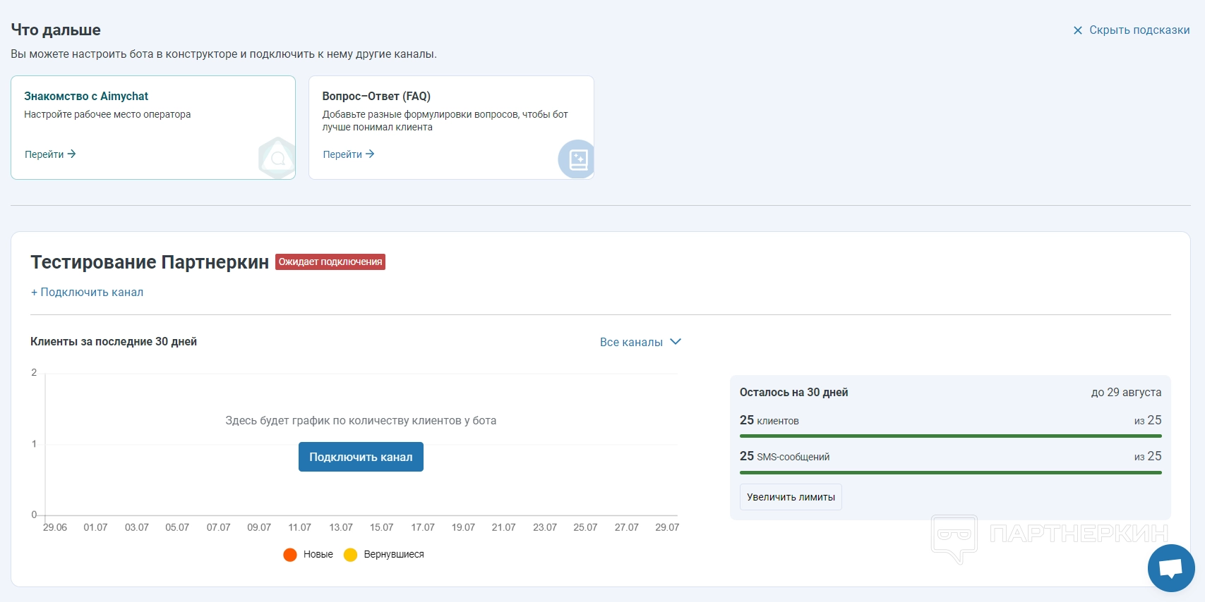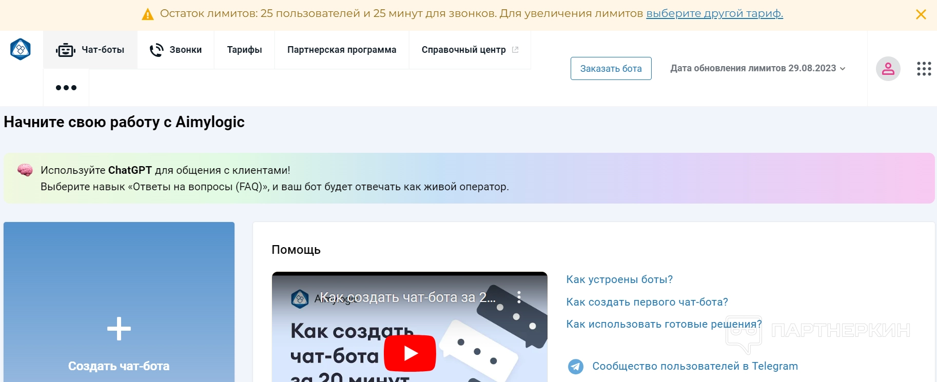 6. Наконец-то можно получить доступ к рабочей панели — выполнена она в достаточно стандартном, но персонализированном стиле dashboard’а, демонстрируя весь функционал и установленные лимиты. На этой же странице можно найти ответы на вопросы по чат-ботам: зачем это нужно, как создавать, и как пользоваться шаблонами.