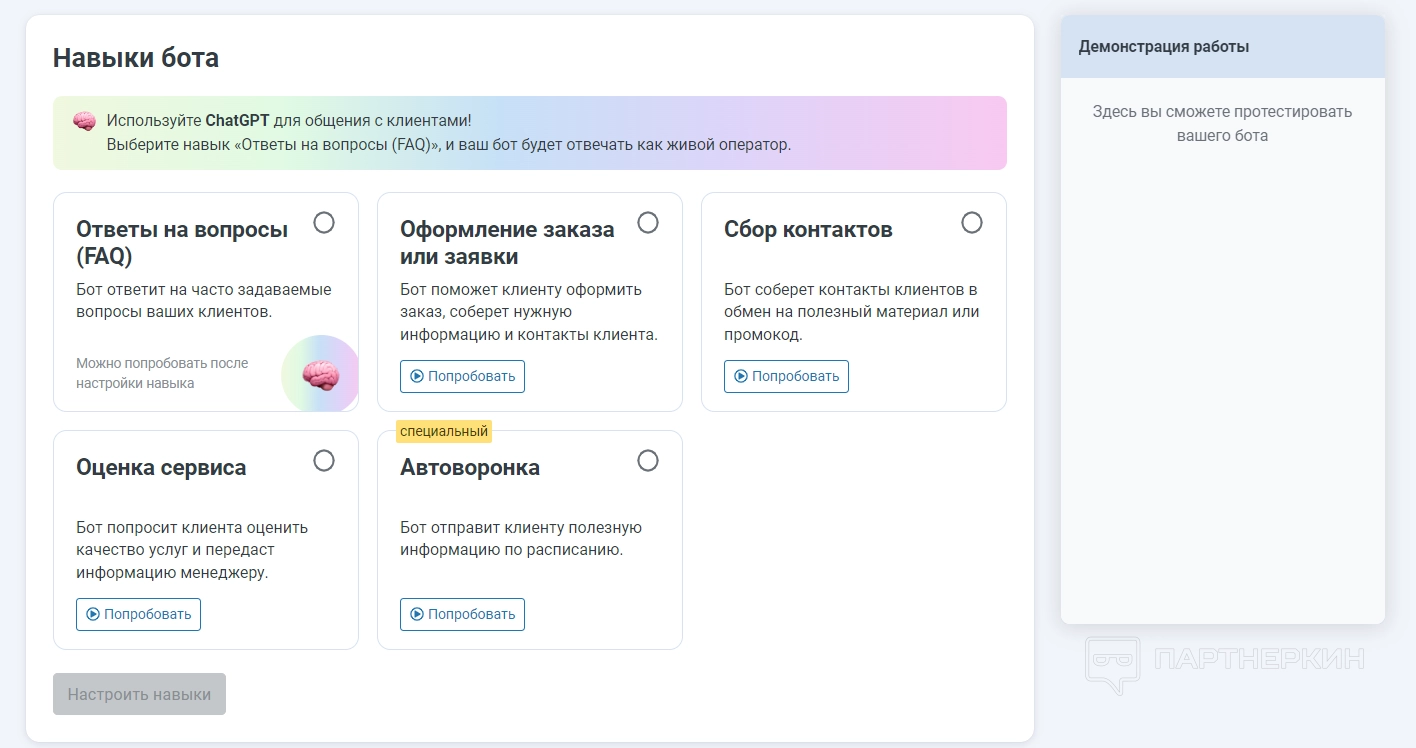 Больший интерес вызывает «Настройка навыков», поэтому начать тестирование стоит именно с нее. Это своеобразная система шаблонов, которая позволяет настроить основные возможности чат-бота, к примеру, ответ на вопросы, сбор контактов, автоворонку или оценку сервиса. Все, что может потребоваться в маркетинговых целях, только без привязки к типу бизнеса.