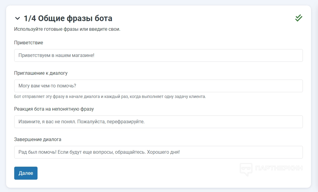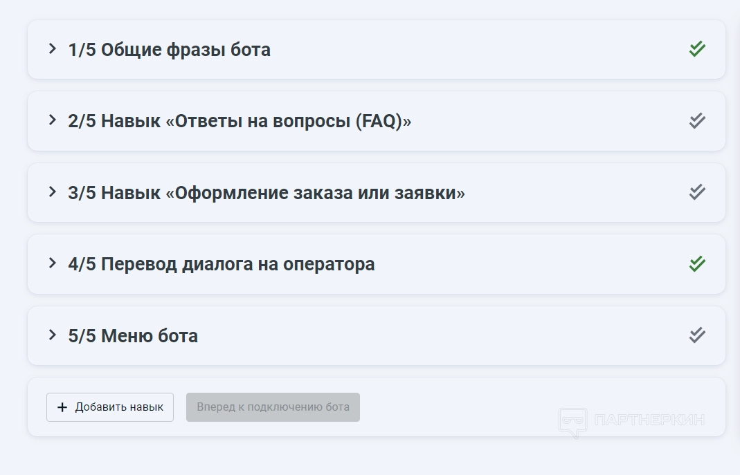 В целом, каждый из навыков добавляет специальные разделы с полями, необходимыми для заполнения. Чем больше выбрать специализаций, тем выше вероятность того, что бот сможет удовлетворить все запросы от пользователей. При этом имеется возможность подключения к диалогу живого оператора — к примеру, если бот затрудняется ответить на вопрос.