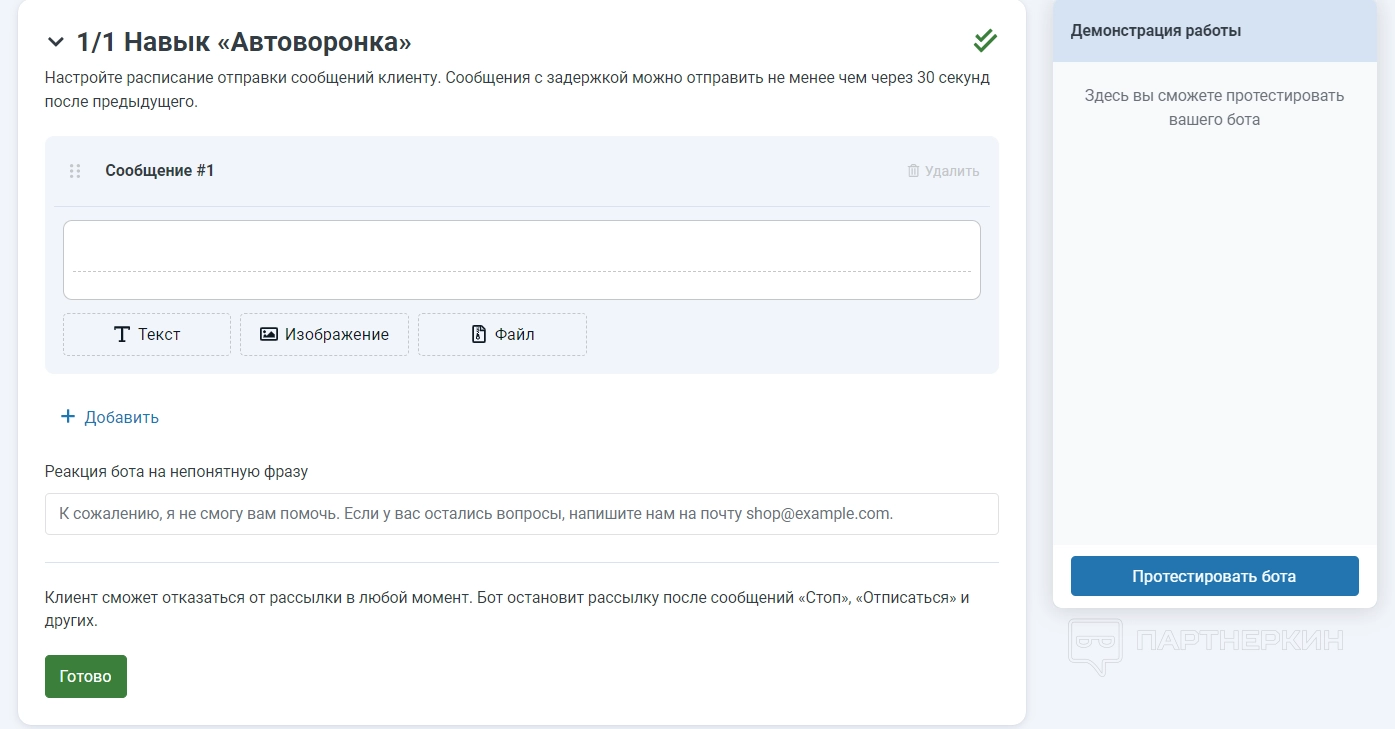 Интересно, что, если выбрать «Автоворонку», другие навыки перестанут быть доступными — то есть, либо настраивать отправку сообщений по расписанию и сигналам, либо настраивать чат-бота на взаимодействие с человеком. Радует, что есть возможность протестировать работу с помощью тестового виджета справа.
