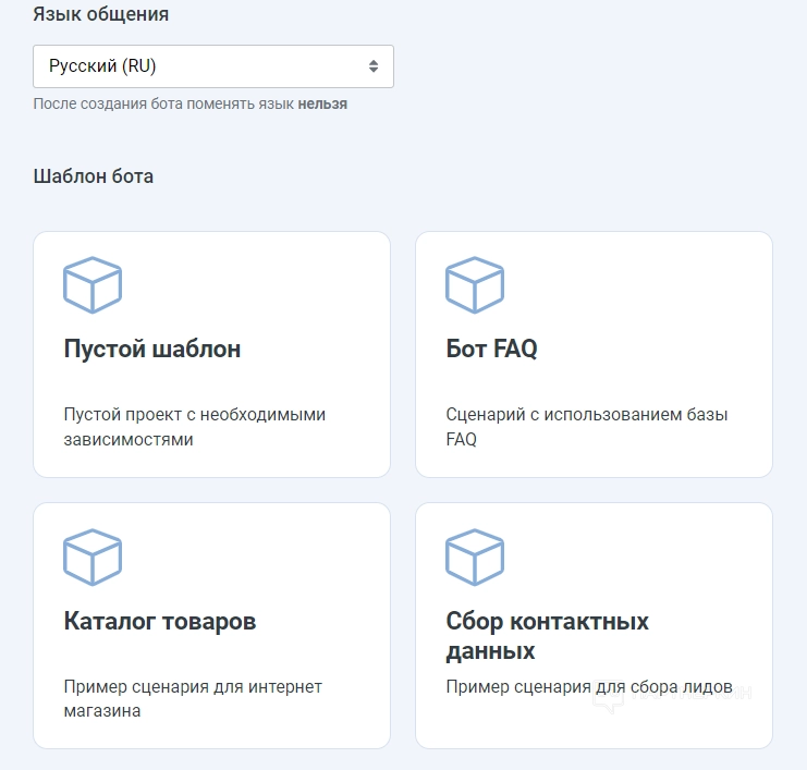 Если работа с искусственным интеллектом пока что не кажется хорошей затеей, или требуется более специфичное решение по чат-боту, можно воспользоваться встроенным конструктором. В целом, имеются шаблоны, включающие в себя ответы на вопросы, сбор контактных данных пользователей, а также представляющие каталог товаров. Стоит отметить, что также на этапе создания бота выбирается его основной язык общения.
