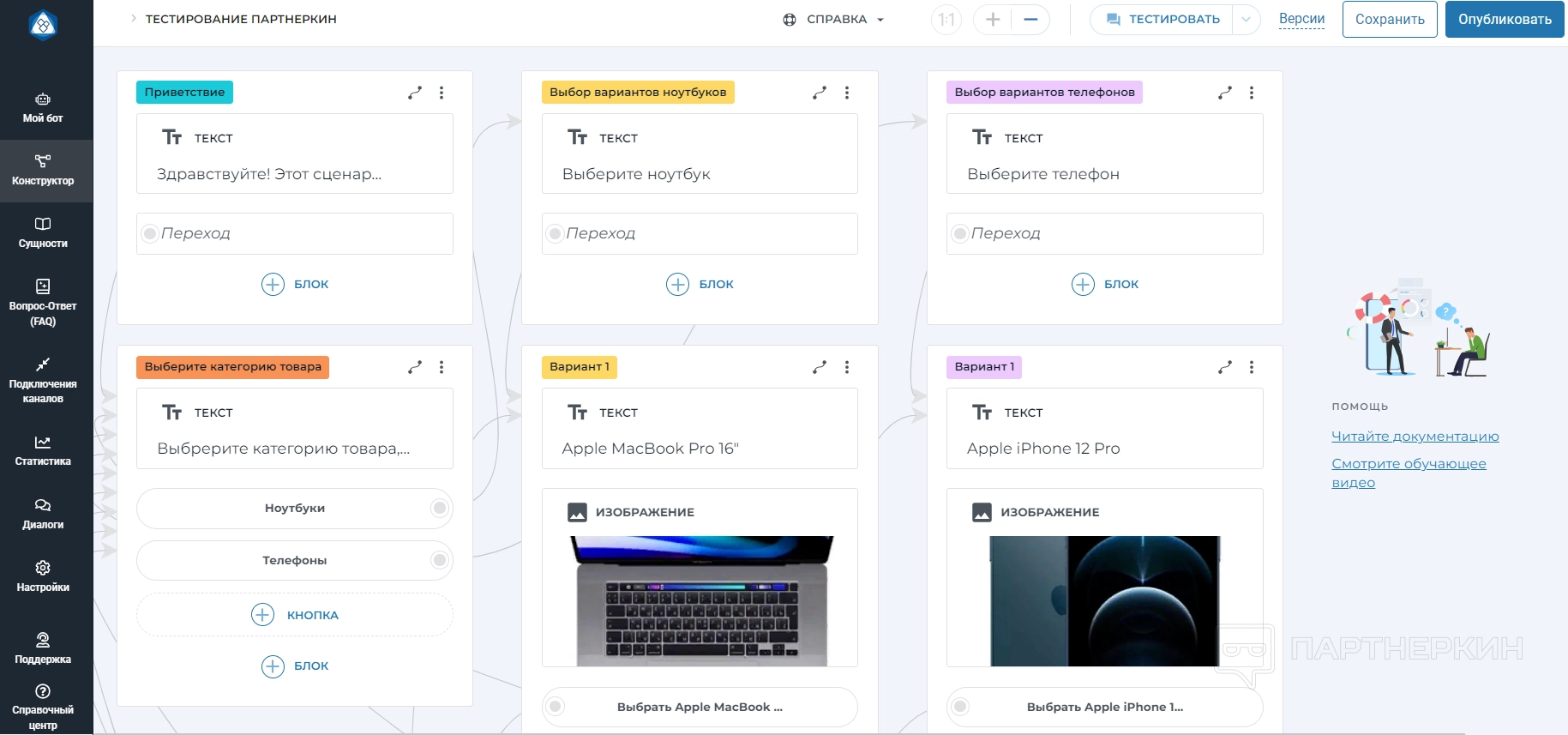 Данный этап демонстрирует максимально привычный конструктор для работы с чат-ботами — блок-схему, в которой разработчик должен настраивать связи между блоками и выбирать их содержимое. Если ранее был опыт в аналогичных проектах, разобраться не составит труда, потому что функционал без вычурных решений. В то же время есть все необходимое под рукой — от текста до циклов.
