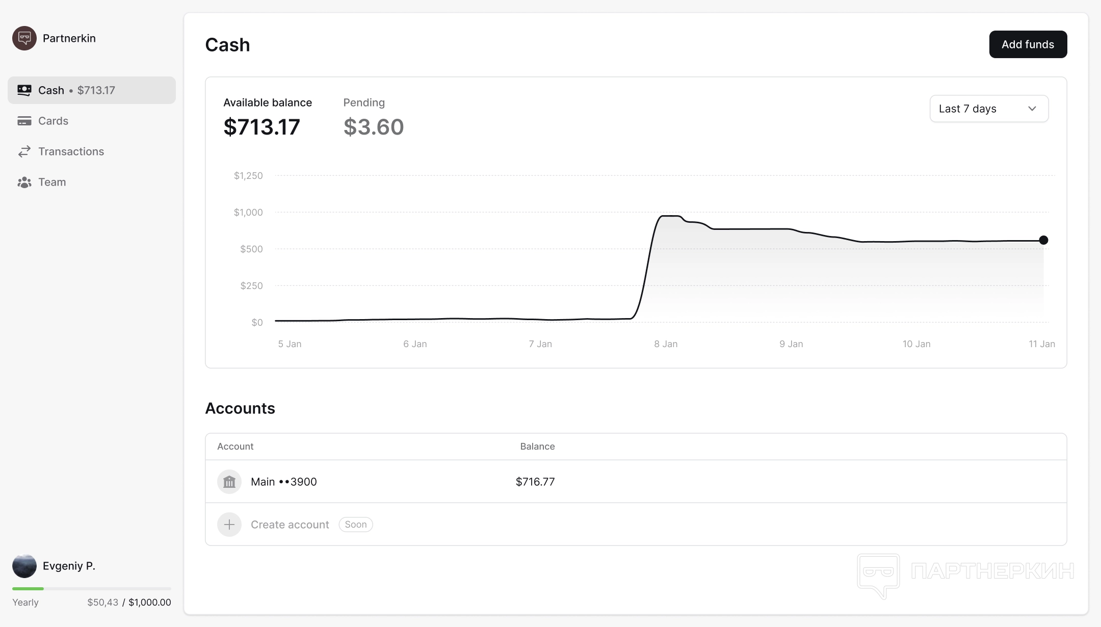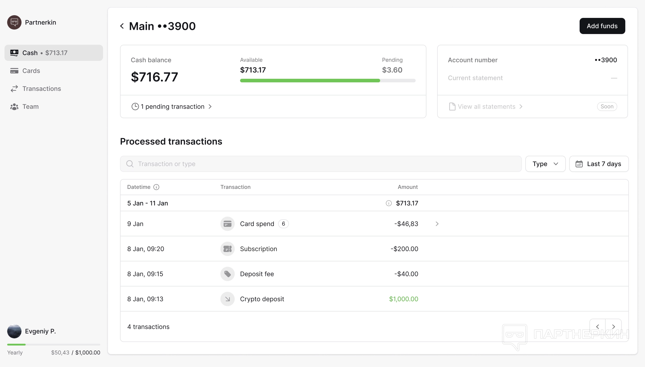 Первый раздел интерфейса Cash (Счет) доступен только администраторам аккаунта. Предназначен для удобного управления финансами. Улучшенный интерфейс позволяет быстро ориентироваться в платежах и расходах, анализировать их динамику и принимать обоснованные решения. Это делает управление финансами прозрачнее и упрощает прогнозирование для команд.