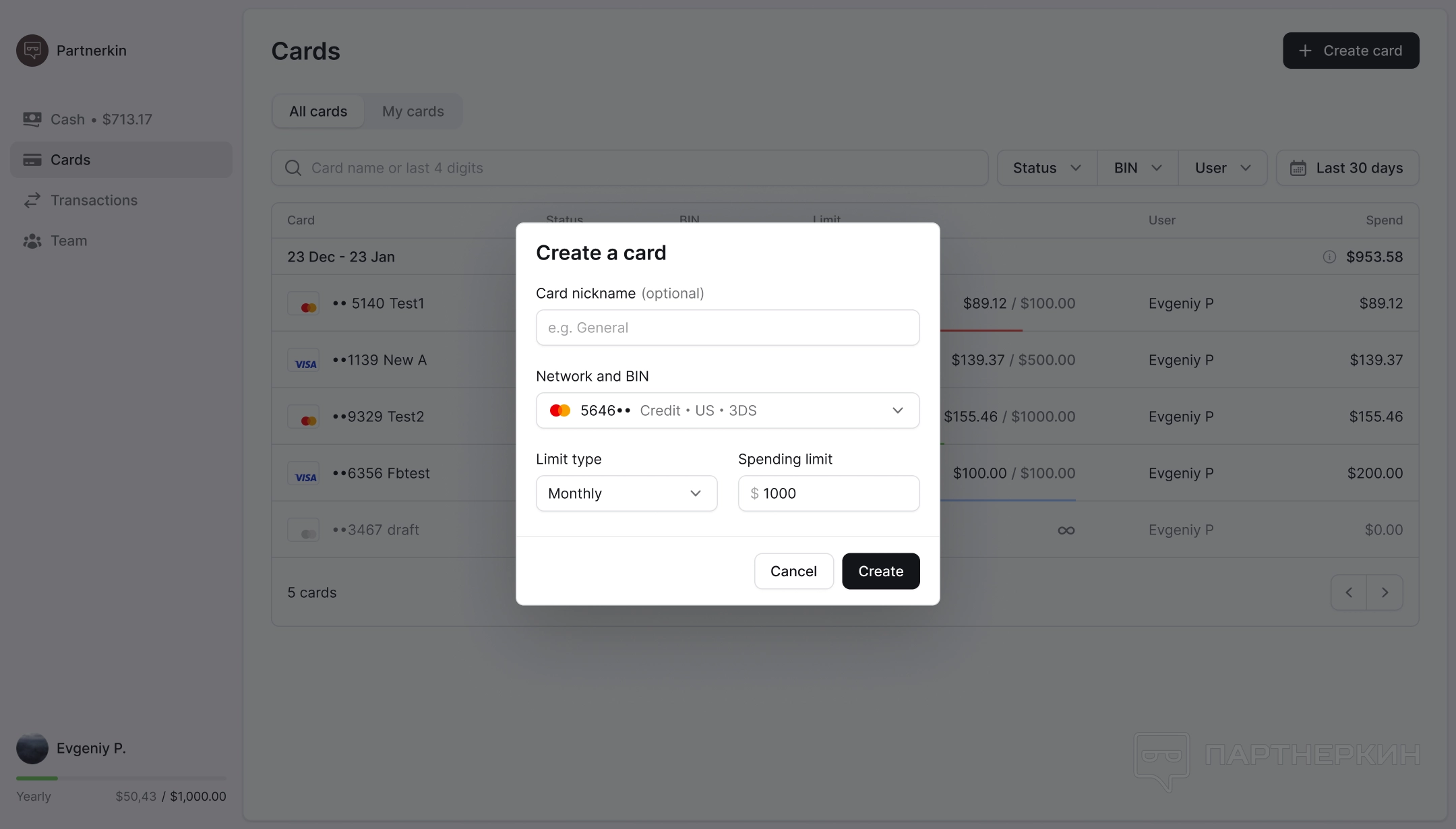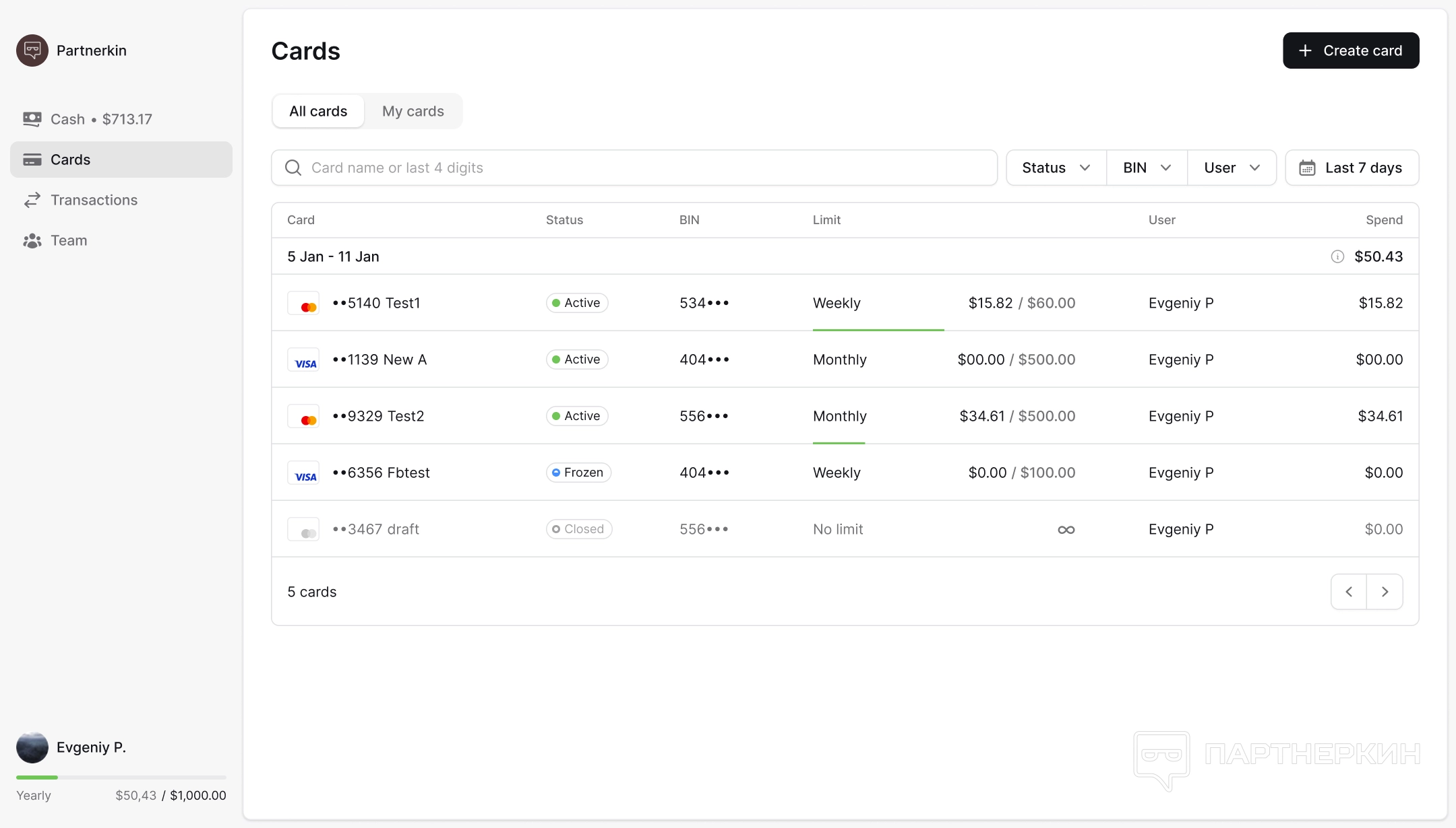 Далее идёт раздел Cards (Карты), где администраторы могут увидеть все карты и их статусы, а сотрудники только свои.