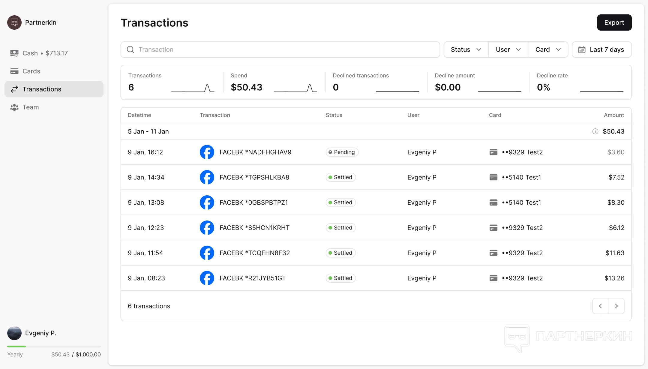 В следующем разделе Transactions (Транзакции) можно в реальном времени просматривать, как происходят платежи, а также там отображаются статы. Можно задавать различные фильтры (по дате, статусу, пользователю) и выгружать отчеты.