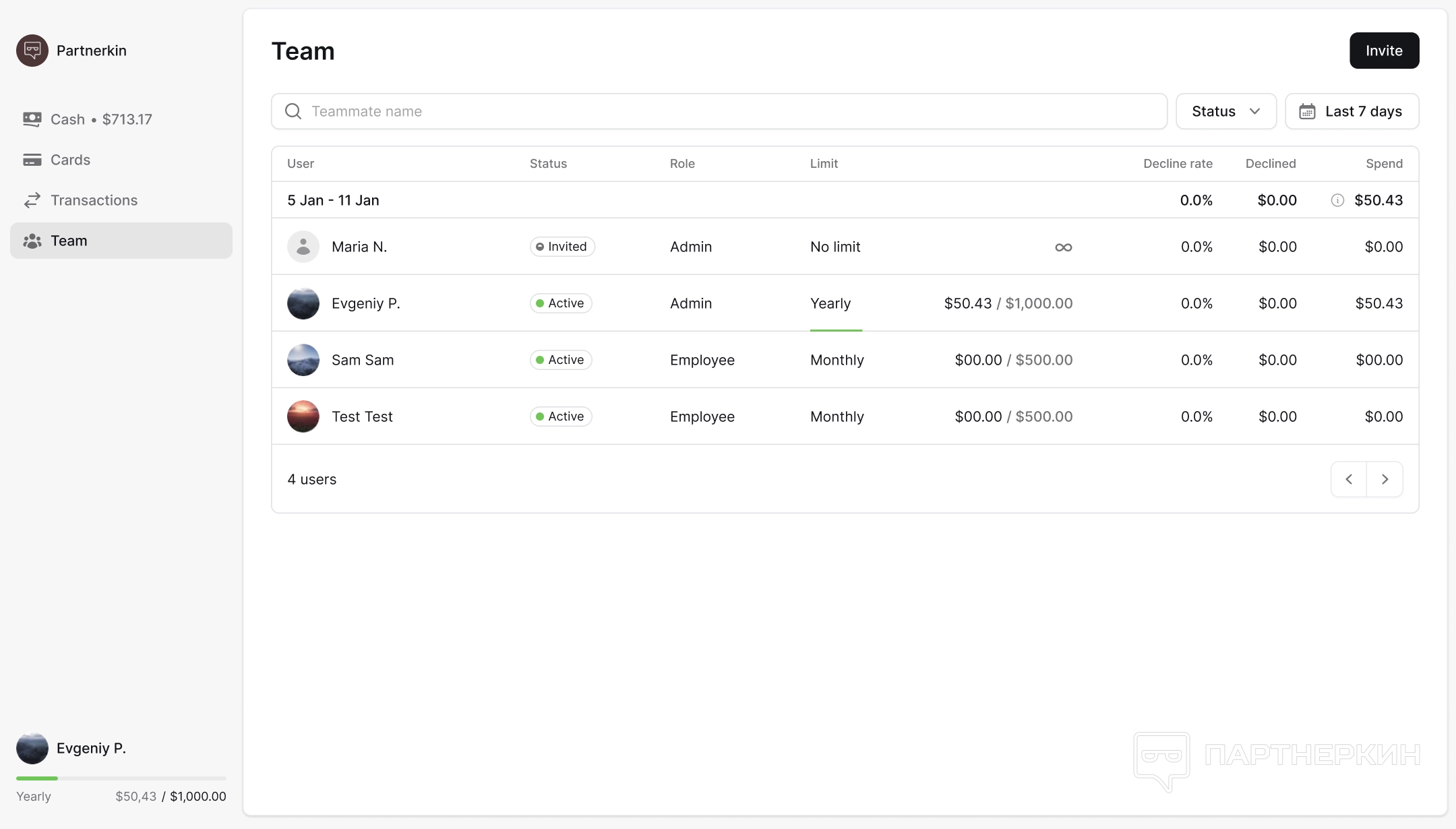 Следующий раздел доступен только администраторам, и в нем можно управлять командой: приглашать новых пользователей, назначать роли и управлять лимитами каждого члена команды.