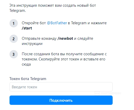 - После создания бота пользователь получит сообщение с токеном. Необходимо скопировать его и вставить в специальное окно.