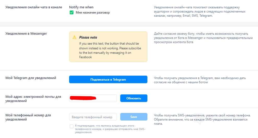 3. Уведомления онлайн-чата в канале. Уведомления онлайн-чата помогают оказывать поддержку аудитории и сопровождать лидов в следующих подключенных каналах (например, email, SMS или Telegram).