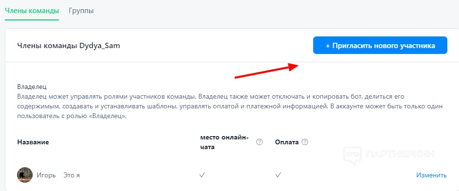 Владелец может управлять ролями участников команды. У него есть возможность отключать и копировать бота, делиться его содержимым, создавать и устанавливать шаблоны, управлять оплатой и платежной информацией. В аккаунте может быть только один пользователь с ролью «Владелец». Чтобы добавить нового участника, необходимо нажать кнопку: