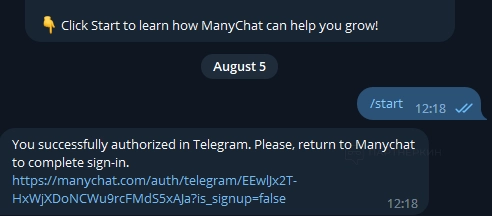 При выборе Telegram пользователя перенаправит в телеграм-бот, где необходимо нажать «start». Система оповестит об успешной авторизации в мессенджере и отправит ссылку, по которой необходимо перейти.