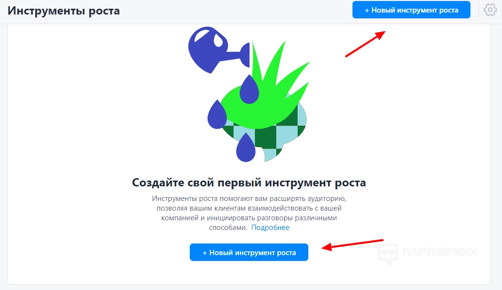 Инструменты роста помогают расширять аудиторию, позволяя клиентам взаимодействовать с компанией и инициировать разговоры различными способами. Для создания первого инструмента роста необходимо нажать кнопку.