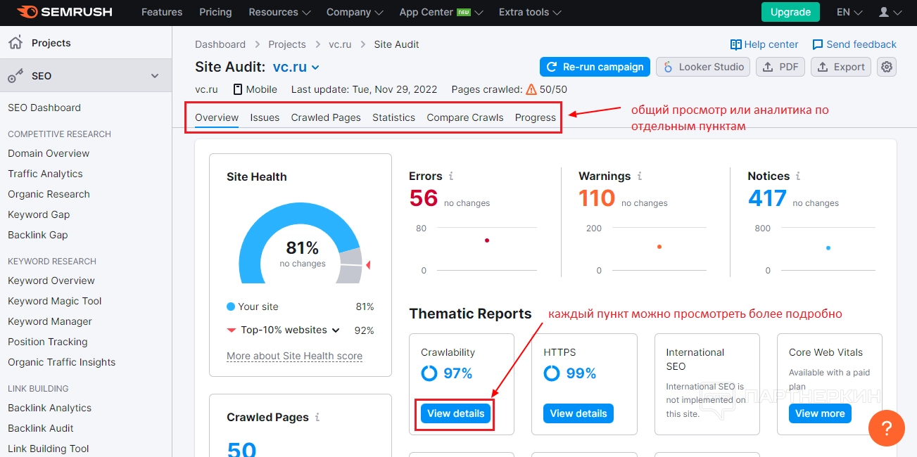 Как и в основном SEO-разделе, здесь можно изменять способы отображения, дату сбора информации и девайсы. Для более детального анализа нужно воспользоваться разделами слева: