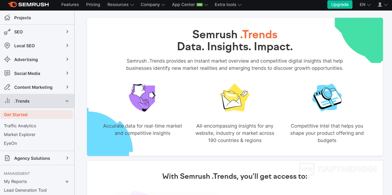 - Trends – анализ самых популярных страниц сайтов-конкурентов и отслеживание активности. Также доступна статистика набирающих популярность в Интернете трендов и подробная аналитика целевой аудитории и их действий.