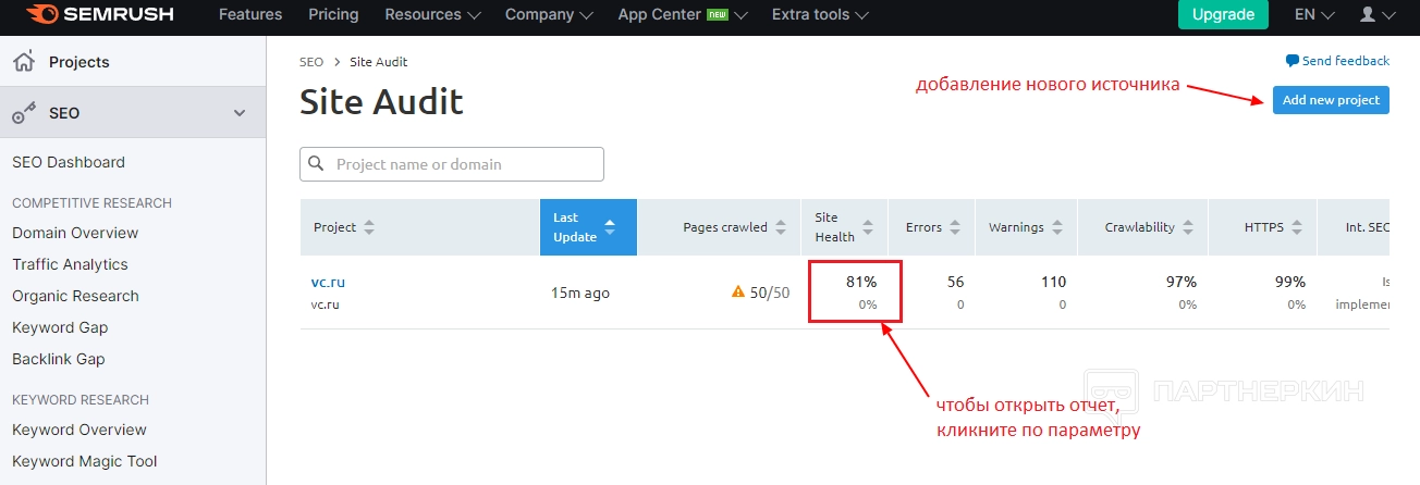 Когда проверка завершится, сайт выведет список проблем и рекомендаций. Просмотреть результаты можно в разделе Site Audit. Там же можно добавить новый ресурс – для этого нажмите кнопку Add New Project. В бесплатном тарифе установлен лимит на 1 URL-адрес.
