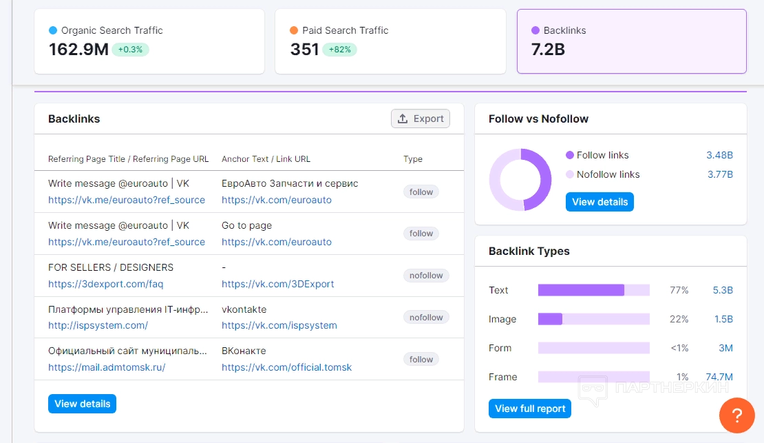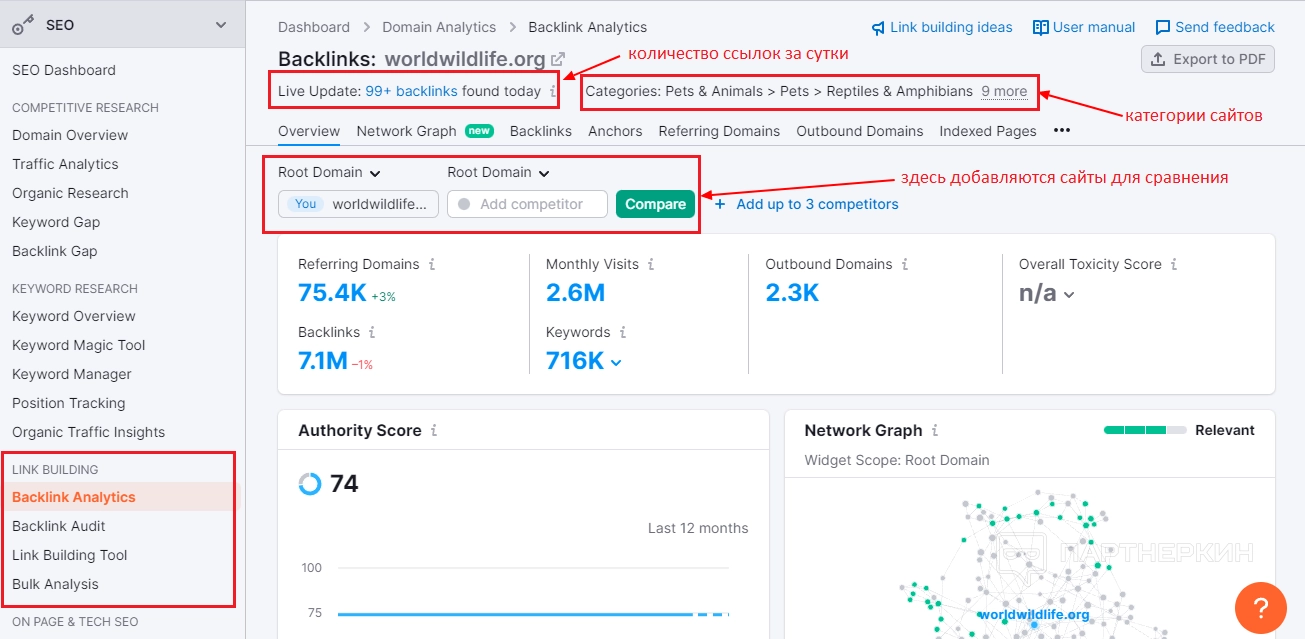 Еще один инструмент, предлагаемый сервисом – отслеживание ссылочной массы. Все данные находятся в разделе Link Building. Здесь можно отследить все ссылки на сторонних ресурсах. Нужно только добавить URL во вкладке Backlink Analytics, и вы получите данные о всех источниках, где упоминается нужный домен: