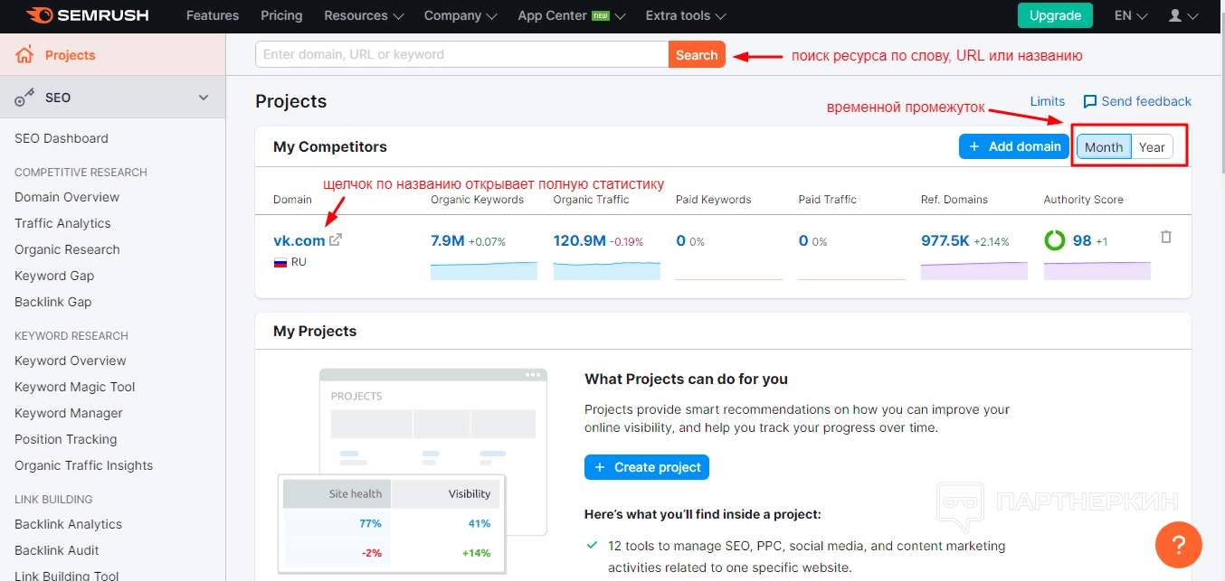 Чтобы просмотреть полную статистику, кликните на название ресурса. Чуть ниже находится блок My Projects. Здесь добавляется ваш сайт – это позволяет отслеживать изменения в поисковой выдаче и сравнивать с конкурентом.
