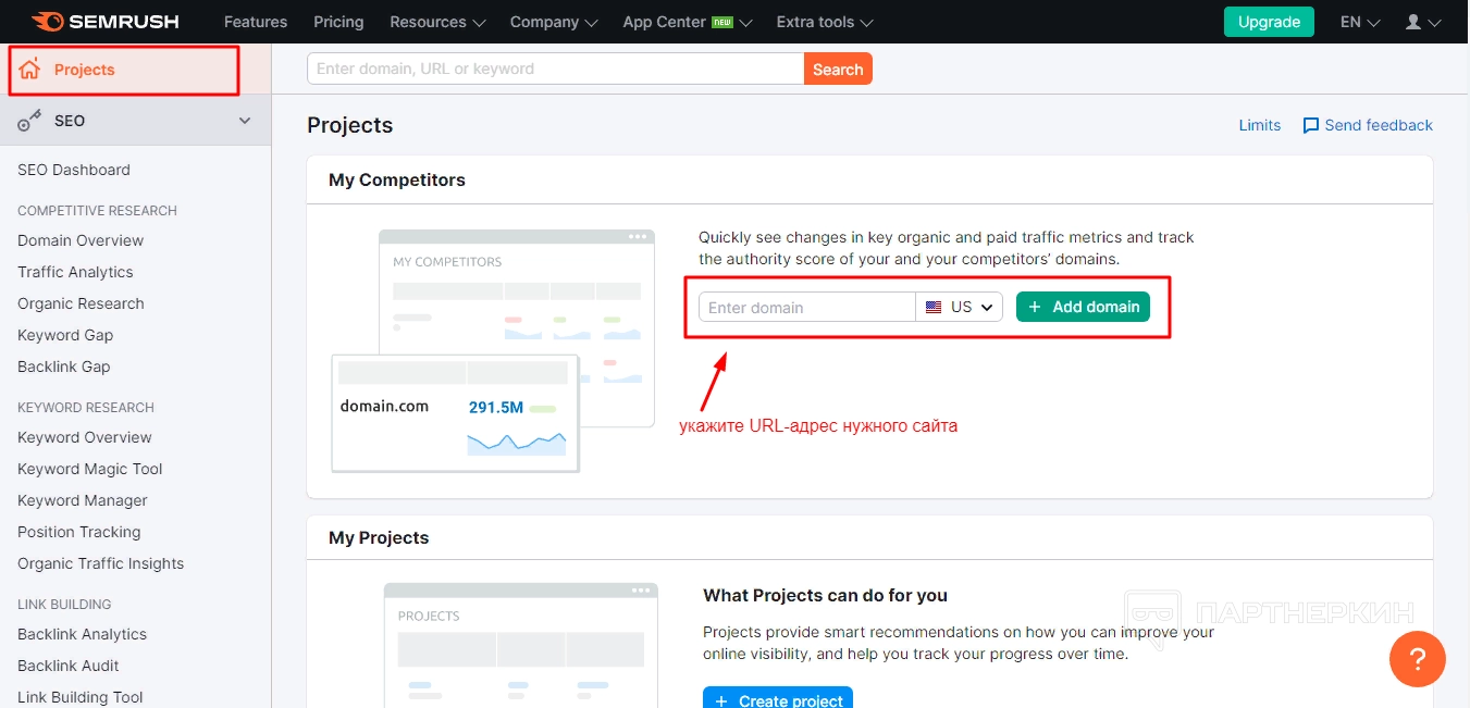Чтобы провести быстрый анализ сайта, добавьте его на главной странице кабинета. Для этого авторизуйтесь и в разделе «Projects» введите URL-адрес в строку Enter domain. Укажите, по какой стране требуется просмотреть статистику, и нажмите Add domain.