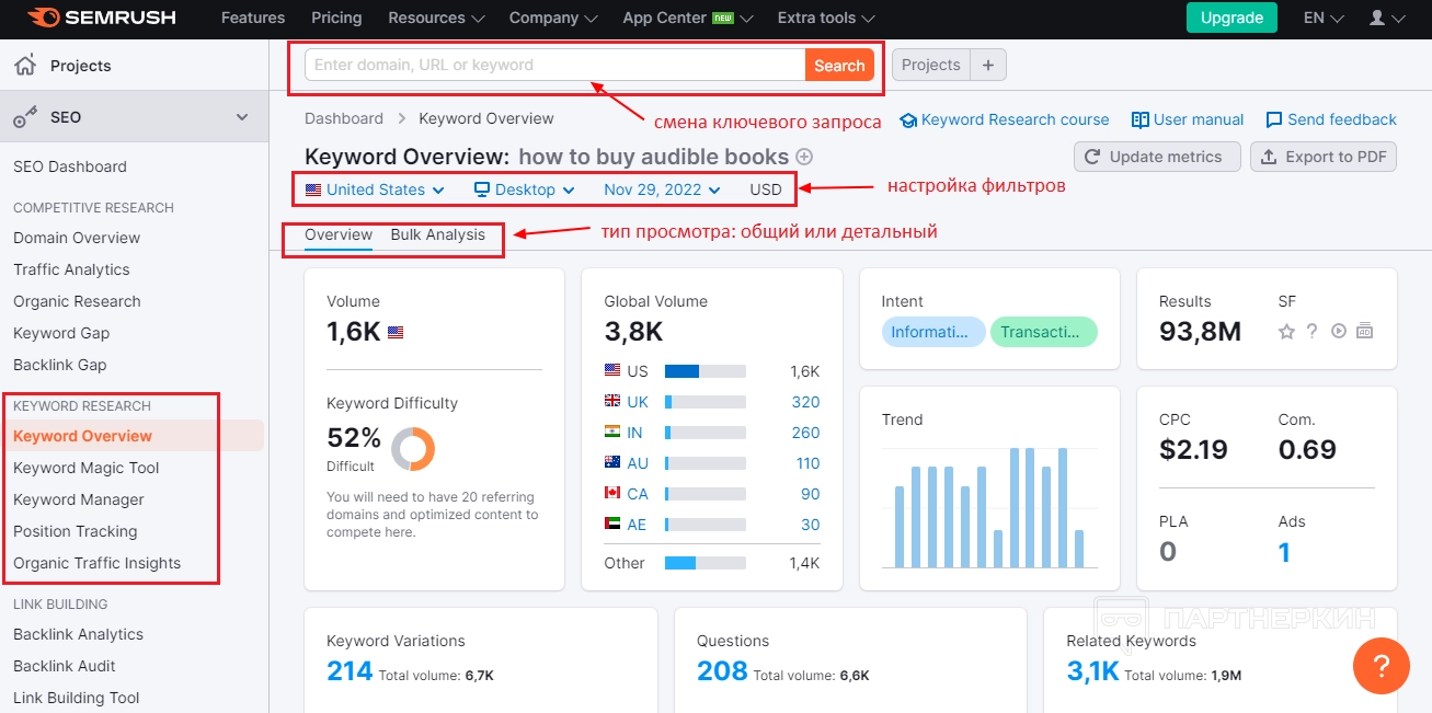 Раздел Keyword Research позволяет еще глубже погрузиться в статистику ключевых запросов. Для этого во вкладке Keyword Overview указывается основной запрос и желаемая страна. После это можно просмотреть: