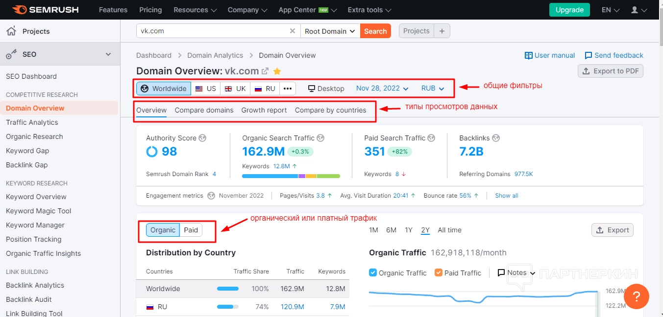 - Traffic Analytics – основные данные по трафику указанного сайта: поиск основных конкурентов по выбранной нише, анализ выбранных доменов, инсайты ЦА, самые эффективные страницы конкурентов. Большинство опций доступно в PRO-аккаунте.