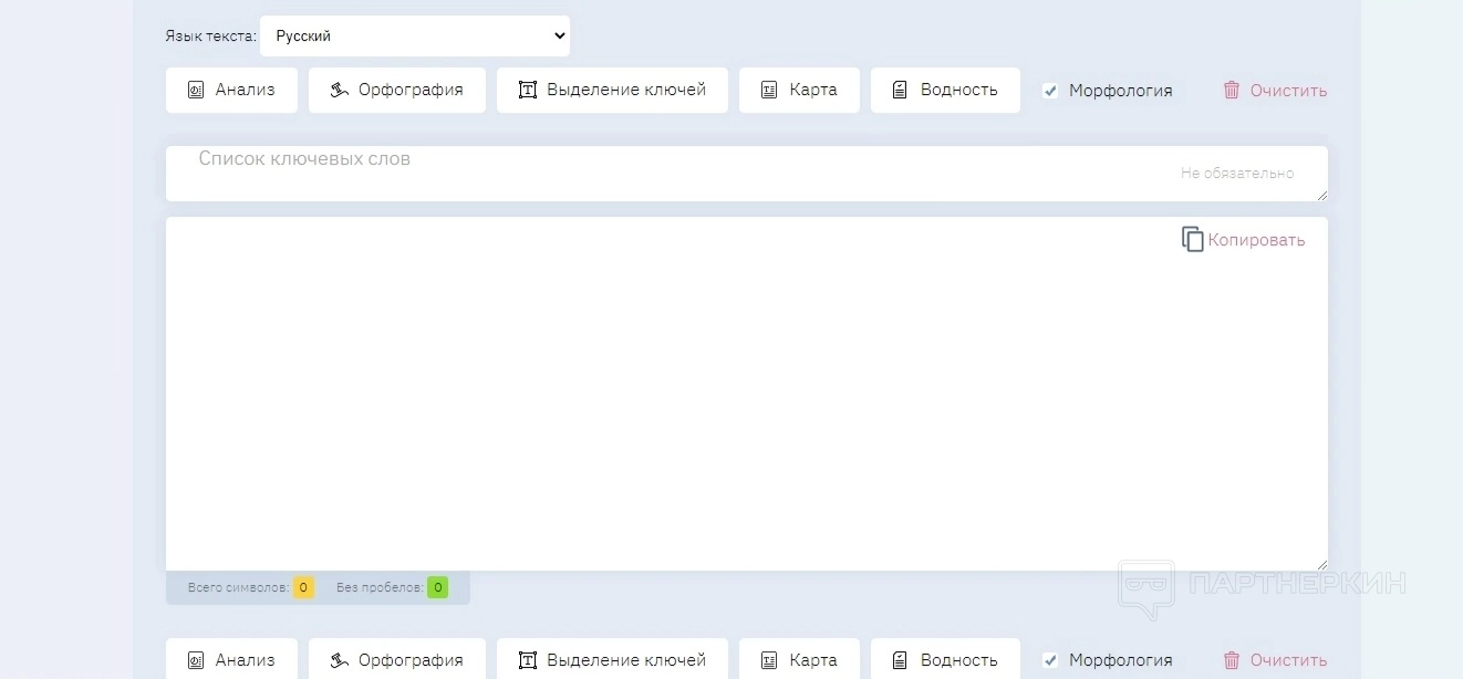 - Улучшение качества текстов и семантический анализ. Данная функция позволяет загружать свои тексты копирайтерам или заказчикам статей для их проверки по основным SEO-параметрам. В данном направлении анализируются длина текста, количество употребленных слов в нем, плотность ключевых слов, а также наличие воды в тексте. Орфография проверяется на более чем 30 языках мира, что позволяет преждевременно выявить все опечатки или ошибки перед загрузкой текста на свой веб-ресурс или отправкой заказчику, однако максимальная корректность проверки достигается только с 4 языками: русский, английский, немецкий и украинский. Чтобы начать проверку, достаточно вставить необходимый текст в специальное окошко и нажать на кнопку запуска проверки. После этого пользователю высветится детальный анализ текста.