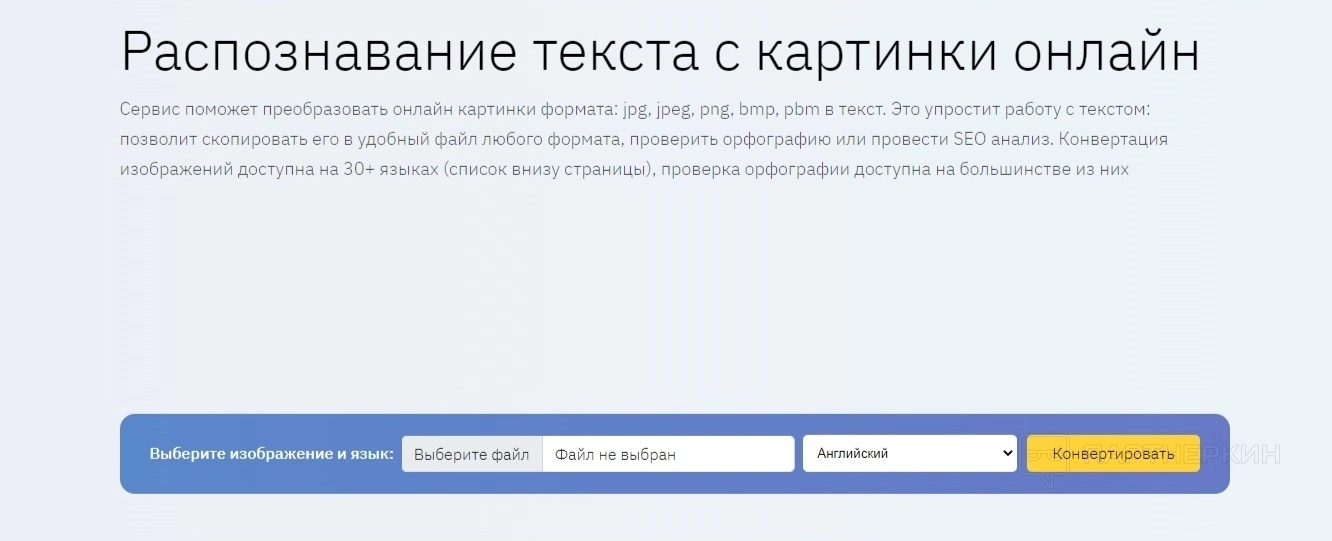 - Распознавание текста с картинки. Функция позволяет обрабатывать графические изображения в текст, который в дальнейшем можно заново загружать и проверять на ошибки, SEO-параметры и так далее. Достаточно в одноименном разделе на сайте загрузить изображение с устройства или с помощью URL в формате JPG, JPEG, PNG, BMP или PBM и запустить конвертер.