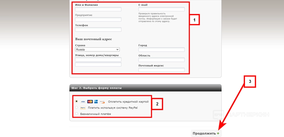- Откроется форма для оплаты. Заполните регистрационные данные (1), выберите вид оплаты (2) и нажмите «Продолжить» (3).