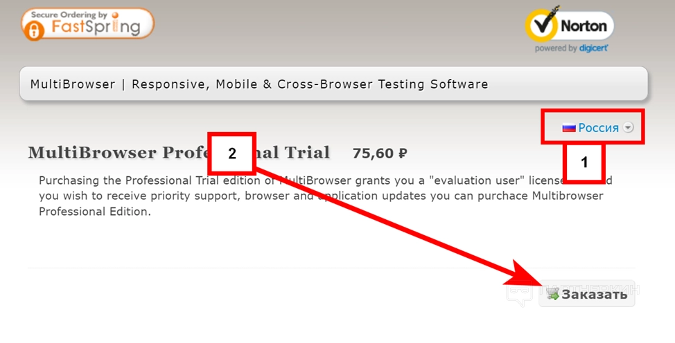 - Для профессионального тарифного плана нажмите на кнопку BUY NOW. Затем как в пакете Evaluation выберите страну и нажмите «Заказать».