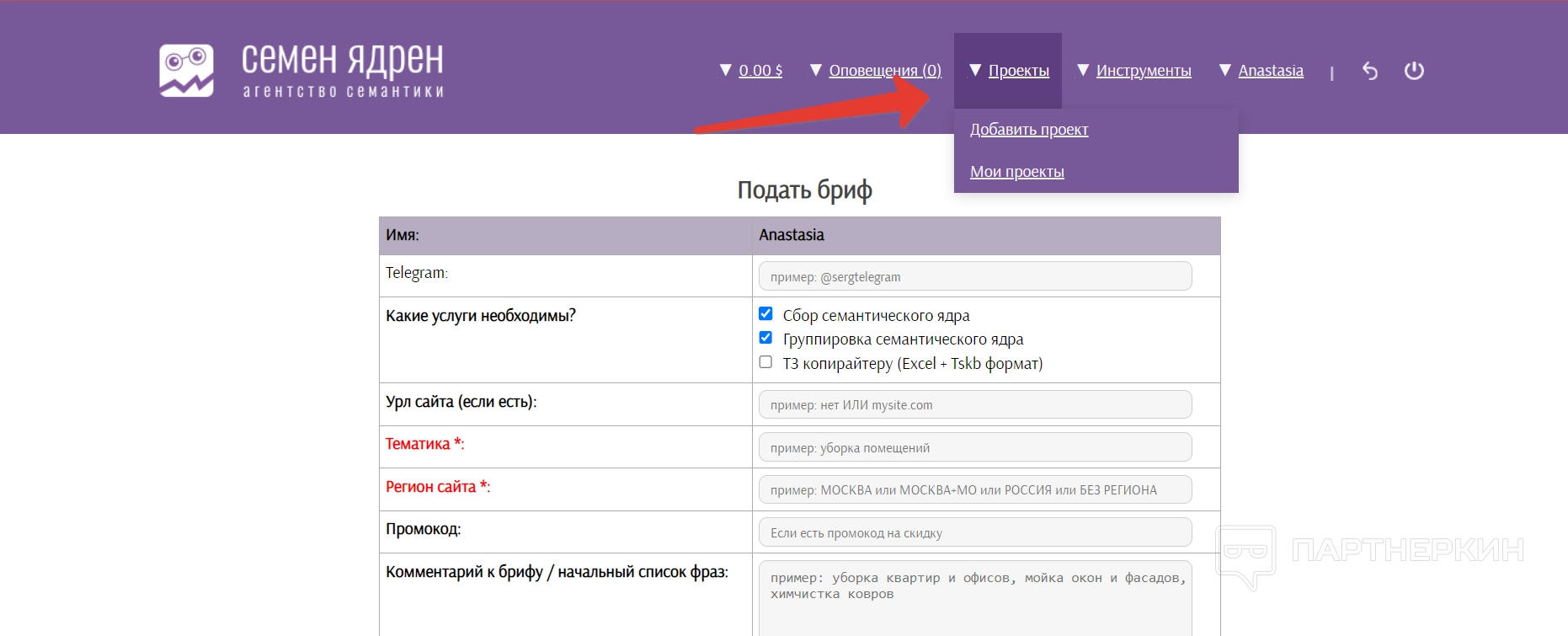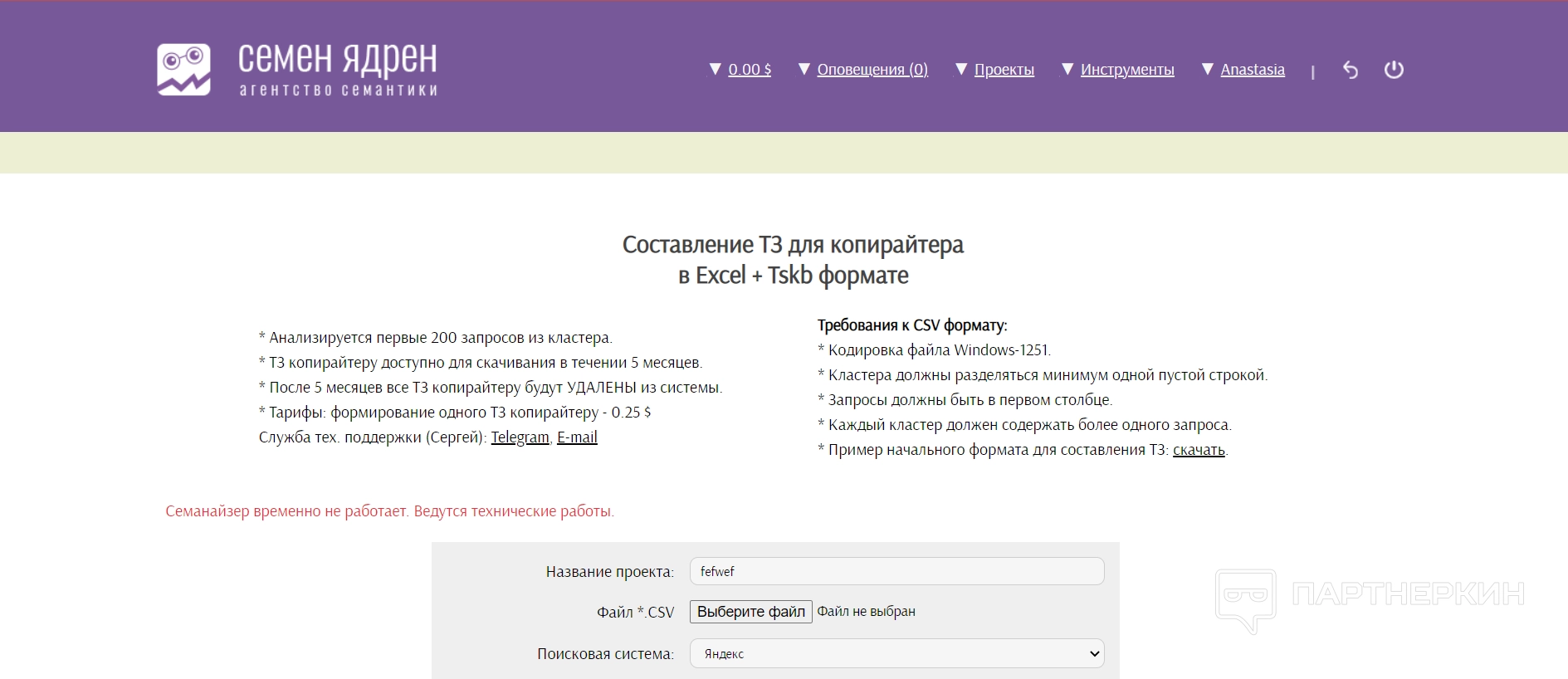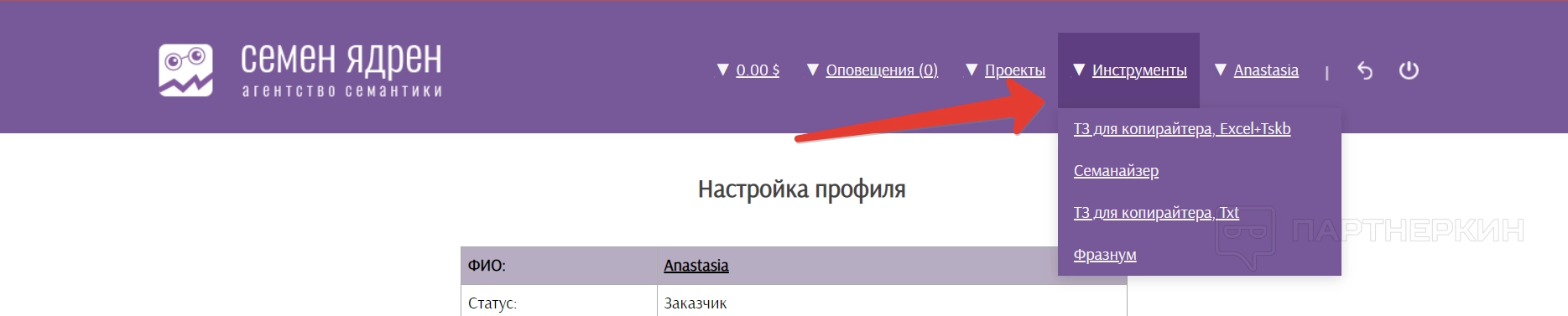 Все услуги находятся в одном меню — это «Инструменты». Здесь можно использовать инструмент для создания технического задания, семанайзер, а также фразнум. Разберем их подробнее.