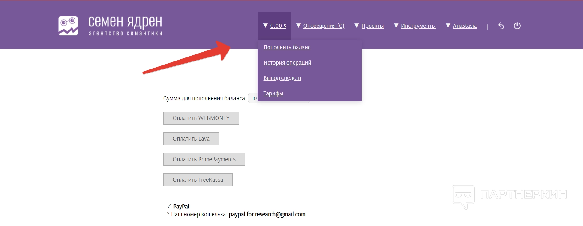 - профиль — в этом разделе показывается основная информация пользователя. Также тут есть подраздел с партнерской программой, в которой можно поучаствовать, и с отчетами по партнерской программе.