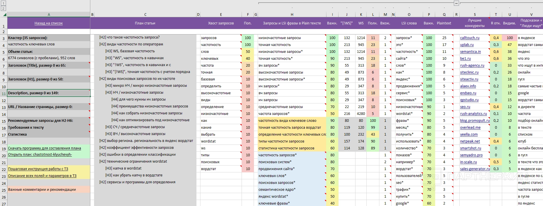 На выходе сервис предоставляет полное техническое задание, в котором будет рассчитан объем статьи, заголовков, дескрипшена, тайтла и урлов. Также система соберет примерную структуру, выделит все популярные ключевые слова и поисковые подсказки к ним. В задании показываются и конкуренты по ключевым фразам, а также предоставляются ссылки на похожие ресурсы для перелинковки. Вот как выглядит пример технического задания, которое создавали на сервисе: