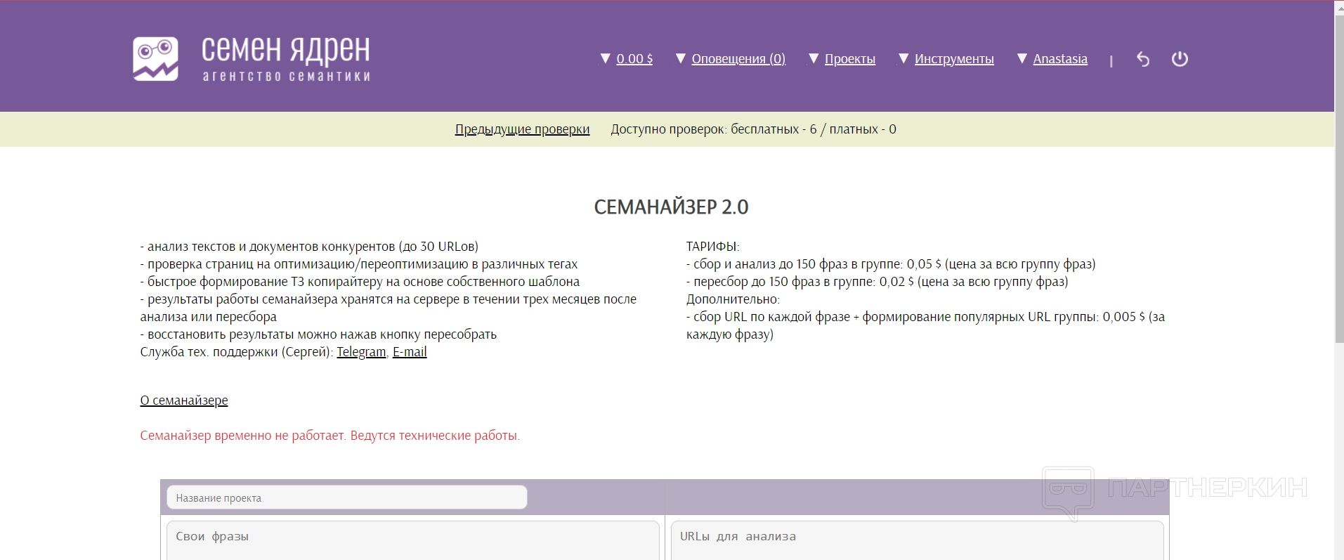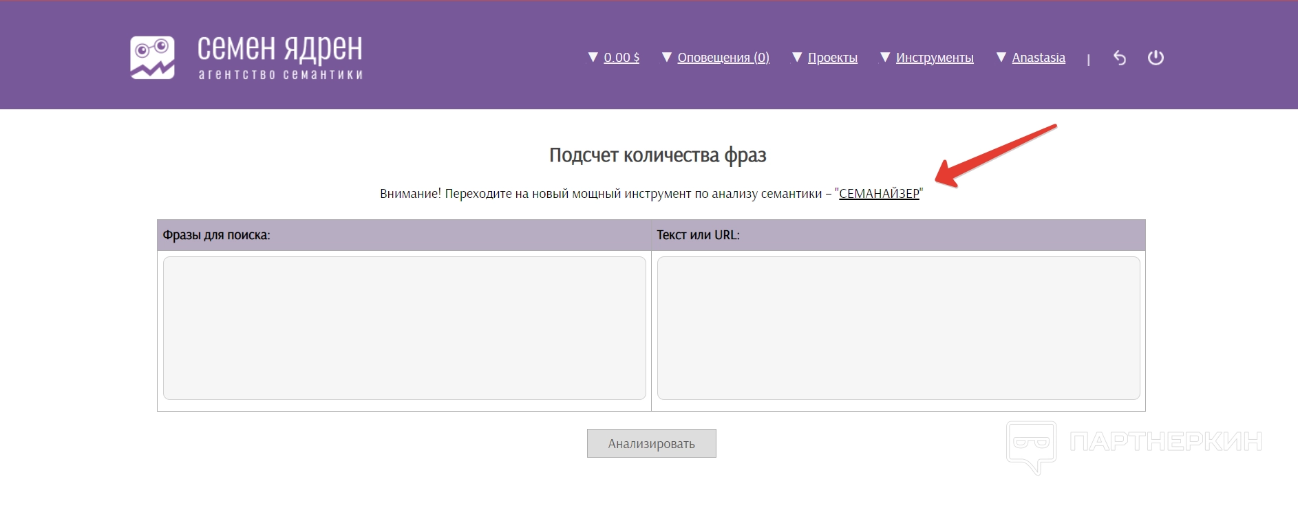 Семанайзер — этот инструмент будет полезен для правильной оптимизации страниц и сайта в целом. Также можно анализировать тексты или отдельные ключевые фразы.