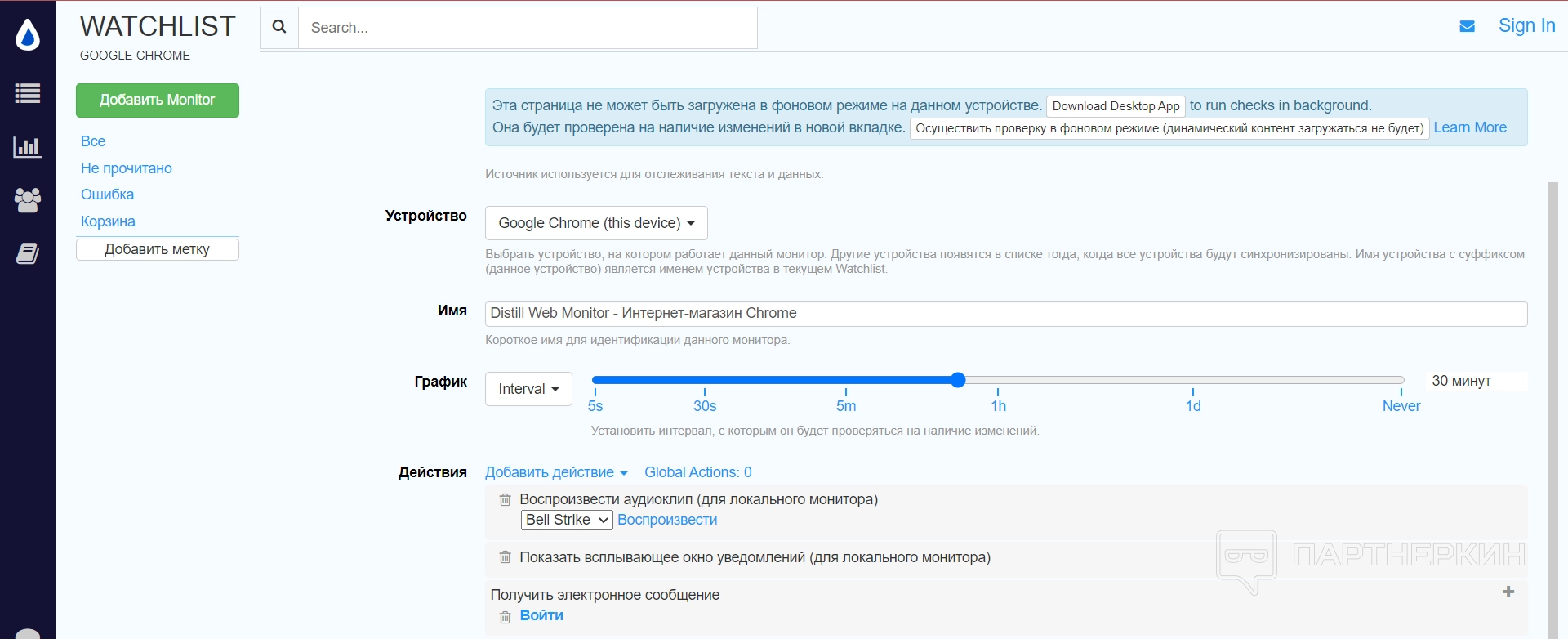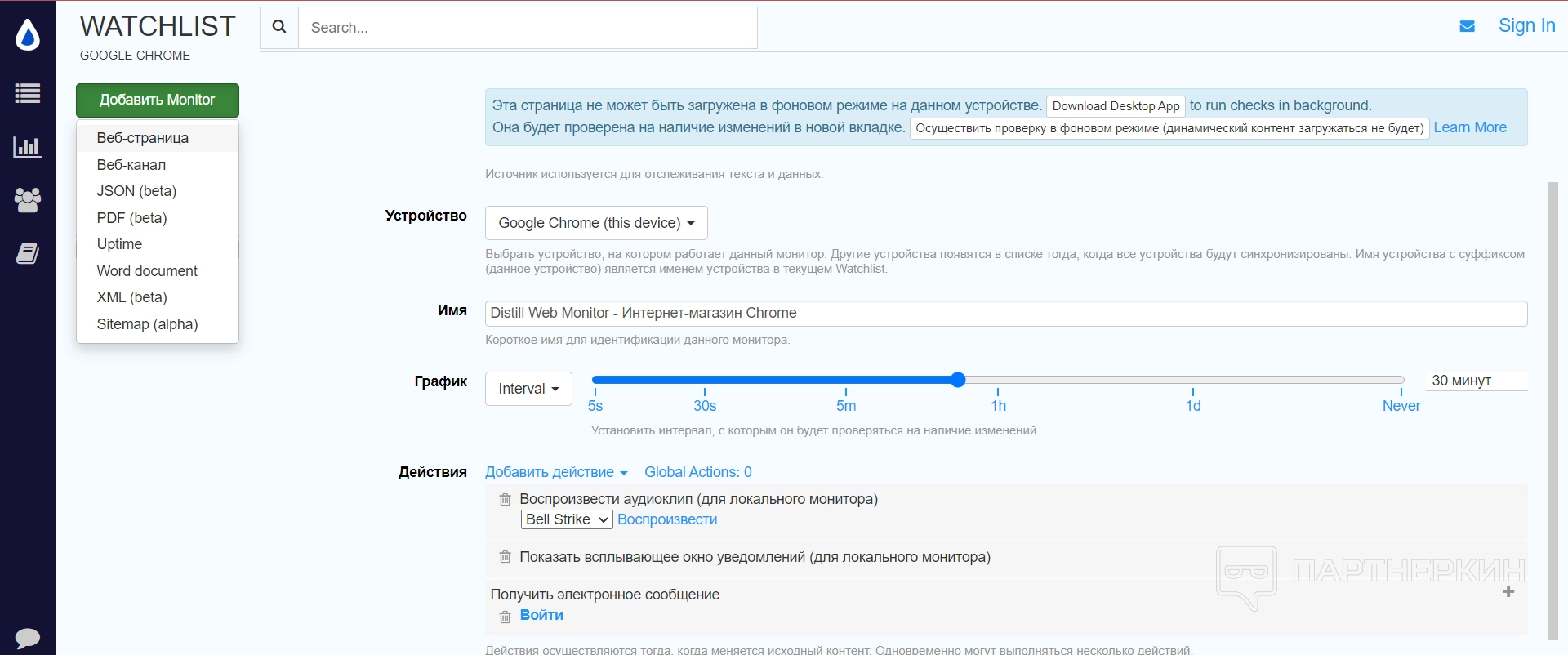 Данная страница не привязана к сервису, и она может показываться фоном, если установлено на устройство приложение. Если есть только расширение, то открываться настройки будут на отдельной странице. Тут можно сразу добавить новый монитор.
