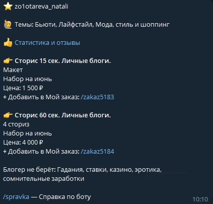 - какие темы не рекламирует блогер (например, ставки на спорт и казино, астрология, карты таро, сетевой маркетинг, гороскопы);