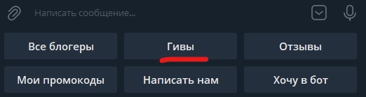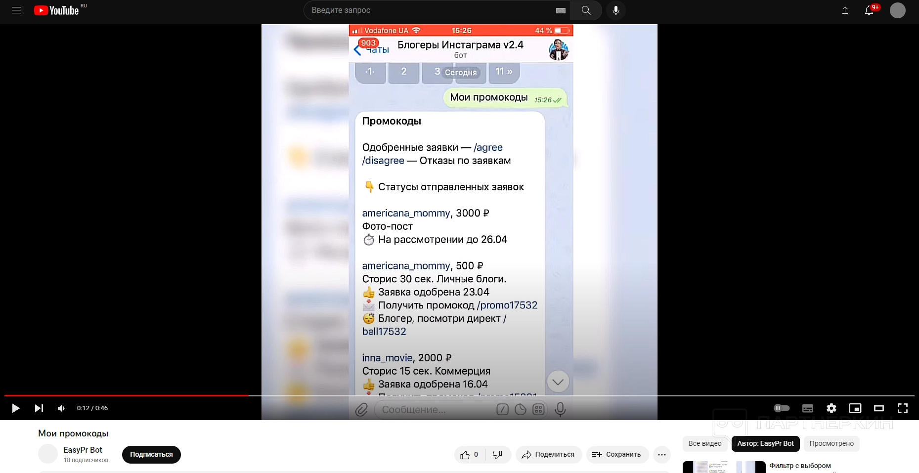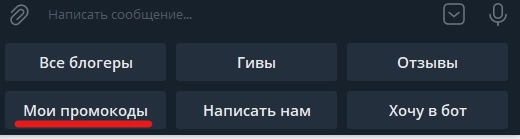 - Выбрать пункт «Получить промокод /promo…». Бот сгенерирует промокод, который необходимо отправить блогеру в директ (или в его PR-аккаунт).