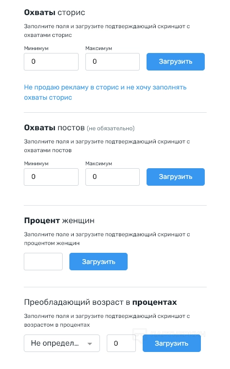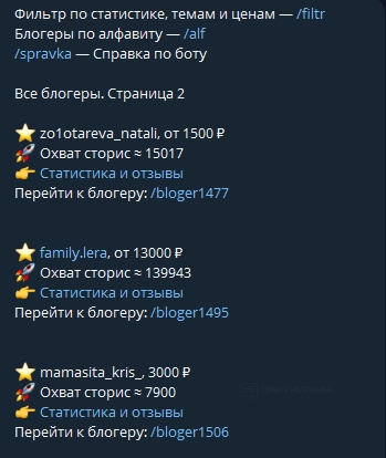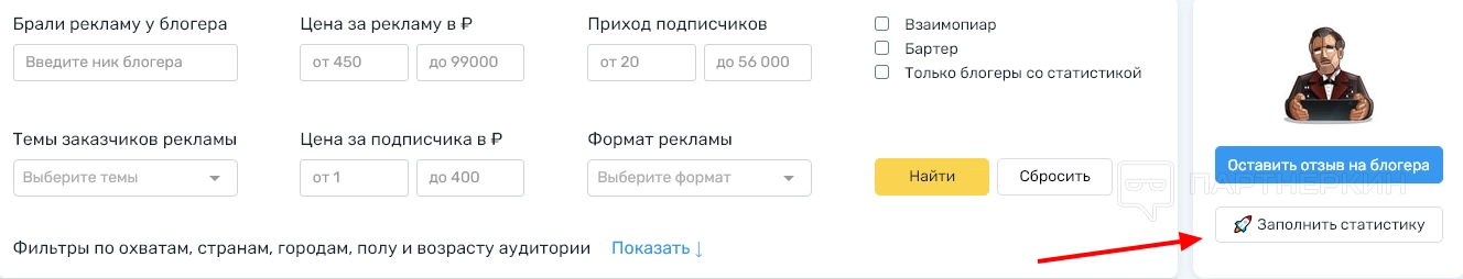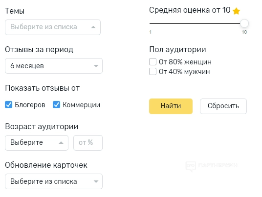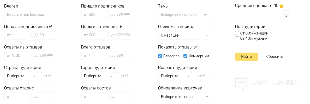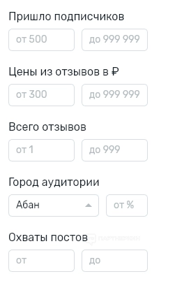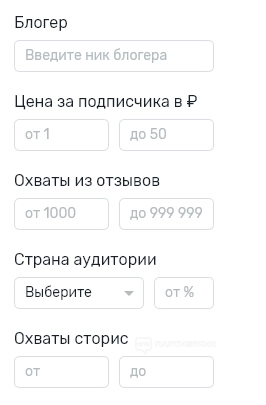 - по ценам и статистике блогеров (по охватам сторис или постов, полу, возрасту, странам и городам. Если инфлюенсер загрузил свою статистику (карточку) на сайт, то она будет показана в результатах);