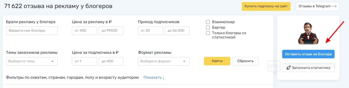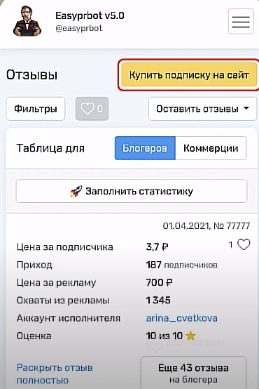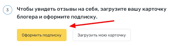Чтобы увидеть отзывы на себя, нужно загрузить карточку блогера (это мы рассмотрели в главе «Как загрузить карточку блогера) и оформить подписку. Для оформления подписки необходимо перейти по ссылке.