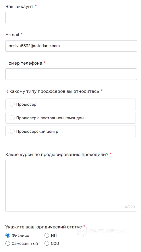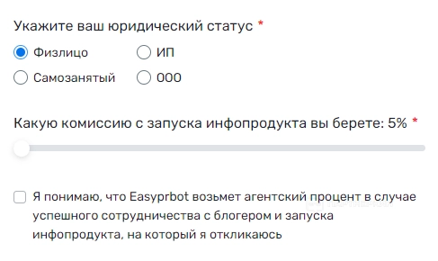 - юридический статус (физическое лицо, самозанятый, ИП, ООО).
