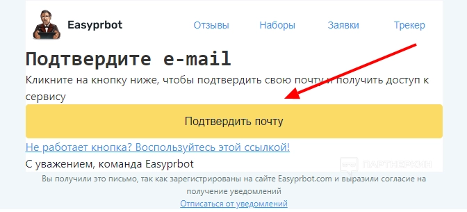 На указанный email придет письмо со ссылкой подтверждения. Чтобы подтвердить почту и получить доступ к сервису, необходимо перейти по ссылке.