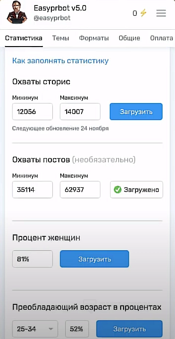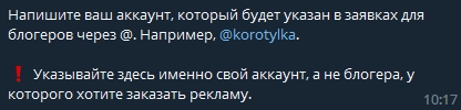 Easyprbotпопросит написать аккаунт пользователя, который будет указан в заявках для блогеров через «@».