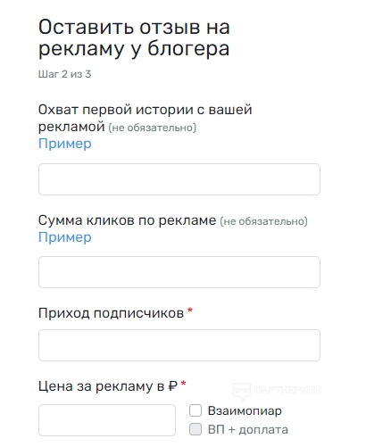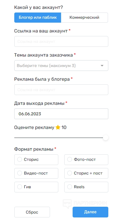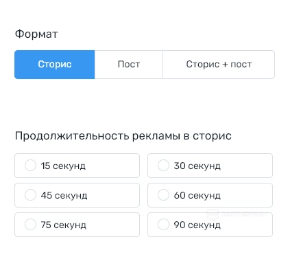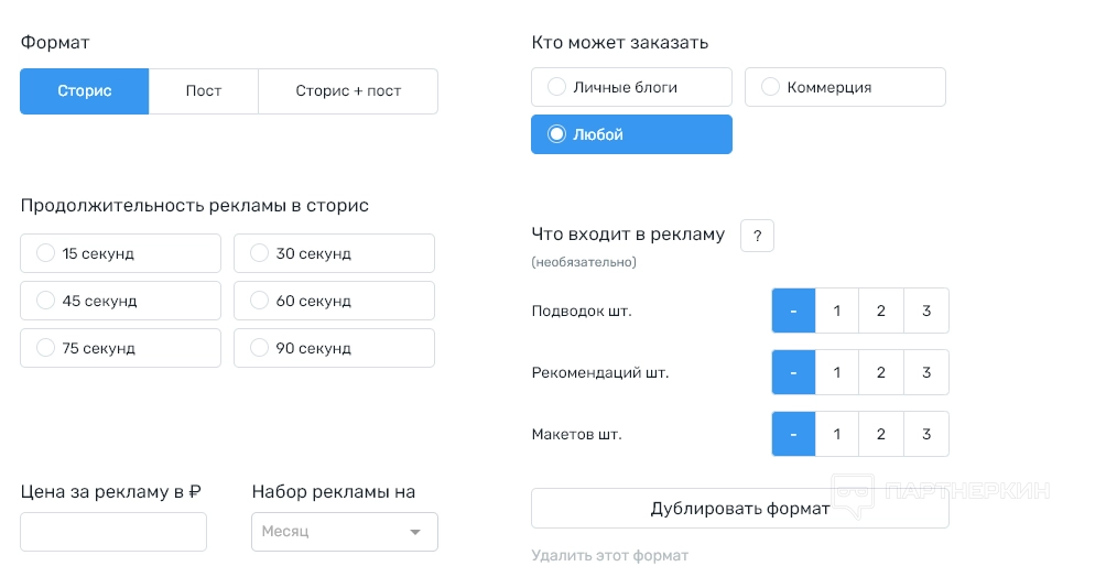 - формат рекламы (сторис, видео-пост, гив, фото-пост, сторис + пост, reels).