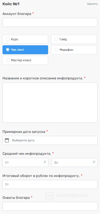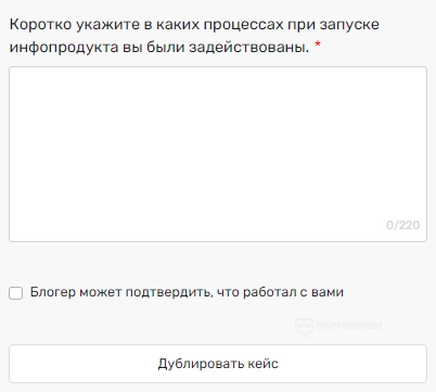 Также пользователю нужно указать, в каких процессах при запуске инфопродукта он был задействован. При необходимости — можно включить опцию «Блогер может подтвердить, что работал с вами».