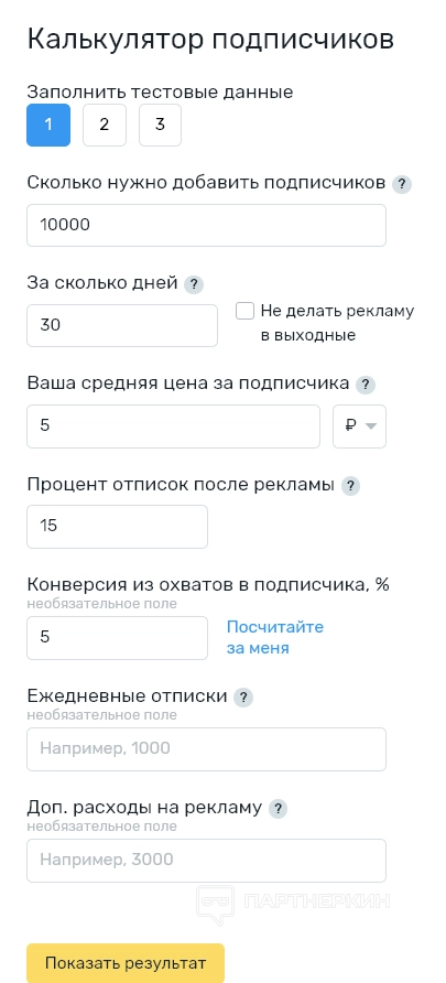 Калькулятор подписчиков поможет поставить цель и рассчитать разные показатели: бюджет, количество охвата (всего, на каждый день, на каждую 1 000 рублей, на полный день). Необходимо заполнить следующие поля:
