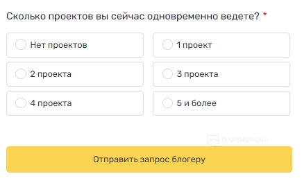 Последний шаг — указать количество проектов, которые сейчас в работе у продюсера (если они есть) и нажать кнопку «Отправить запрос блогеру».