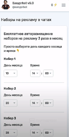 - более 30 наборов на рекламу в месяц в чатах с телеграм-ботом Easyprbot;