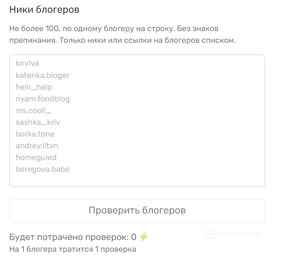 - Вставить список ников блогеров в специальное поле (в столбик). За один раз можно проверить не более 100 инфлюенсеров.