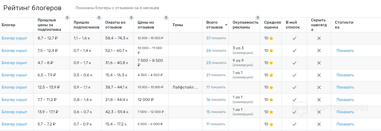После настройки полей необходимо нажать кнопку «Найти». Отобразится рейтинг блогеров, с которыми можно начать сотрудничество. Для анализа инфлюенсеров представлена следующая информация: