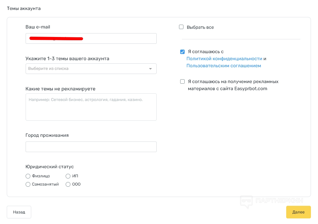 - по желанию — поставить галочку в пункте «Я согласен (-а) на получение информационных и рекламных материалов»;